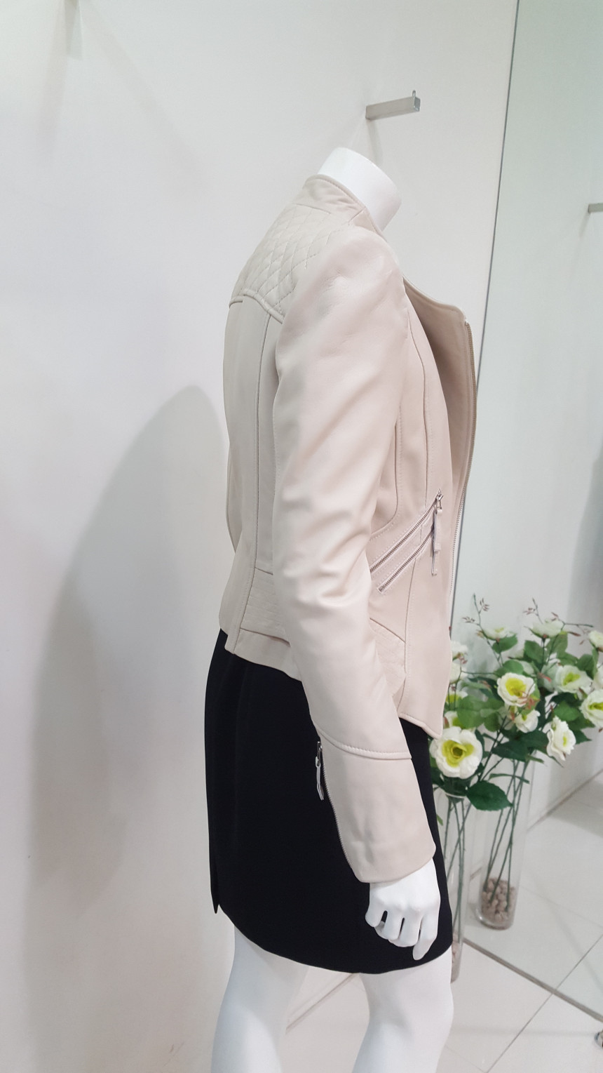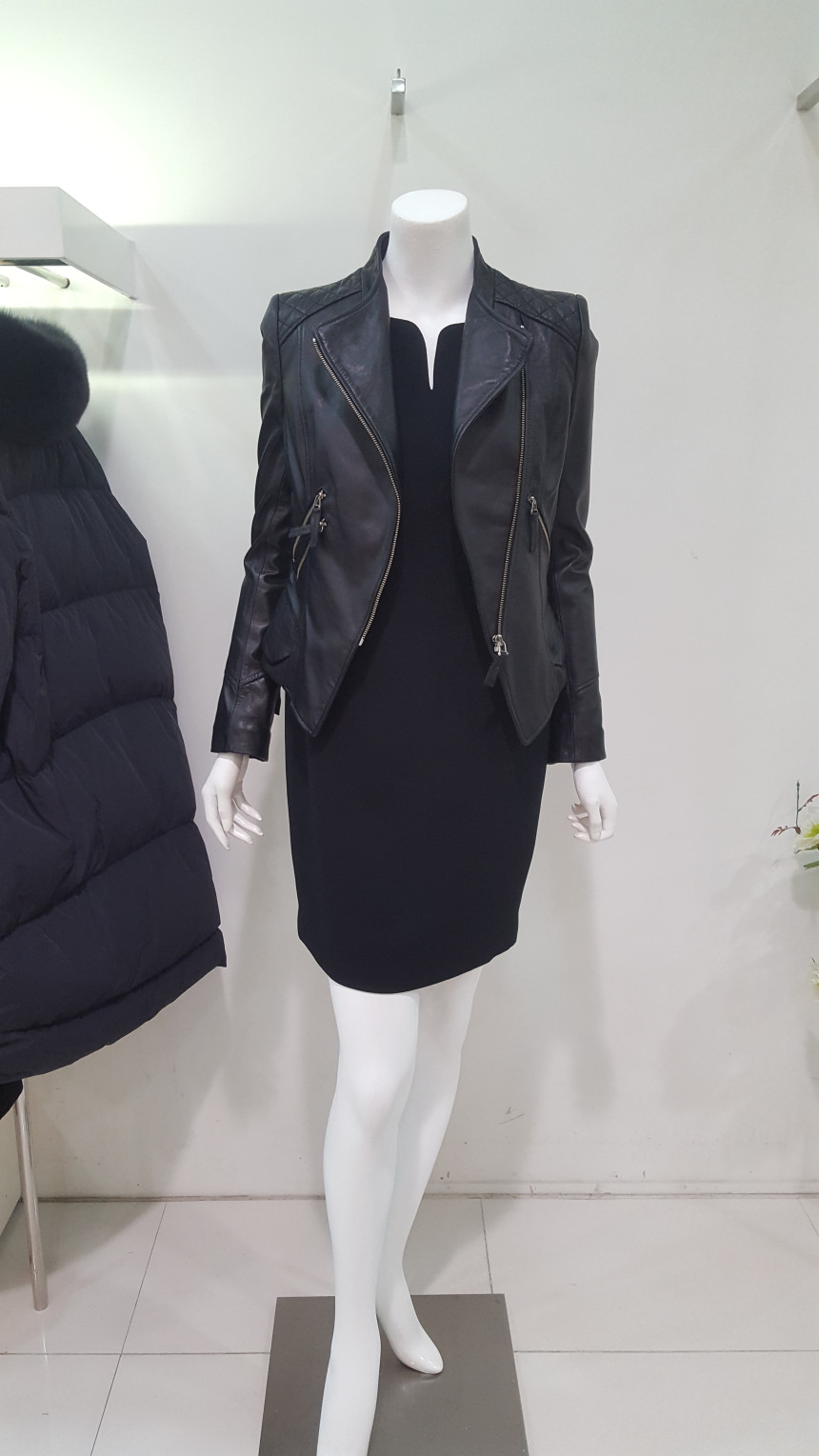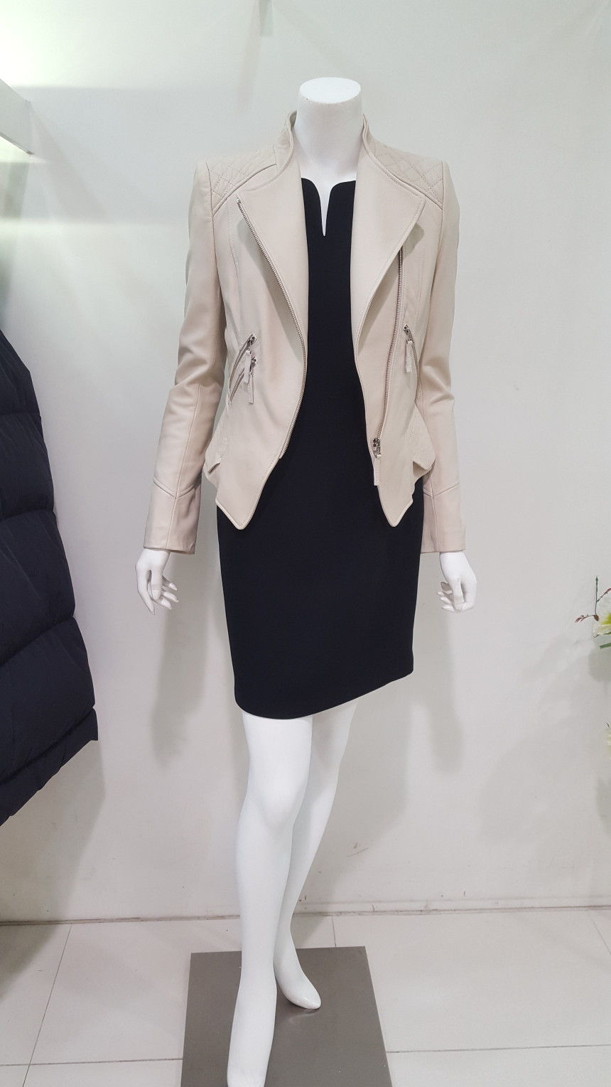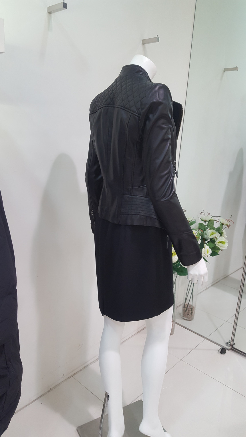 카라가 넓지 않는차이나 카라넥 스타일의 가죽 자킷으로여성스럽고 사선으로 떨어지는