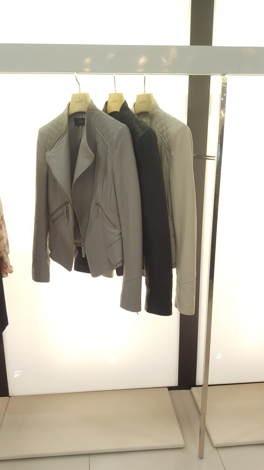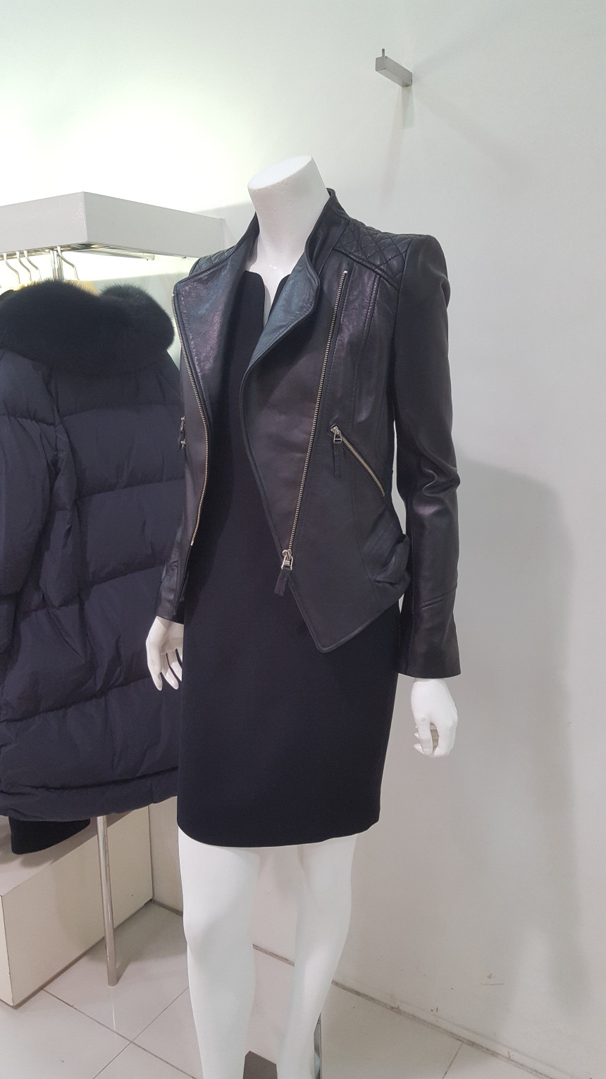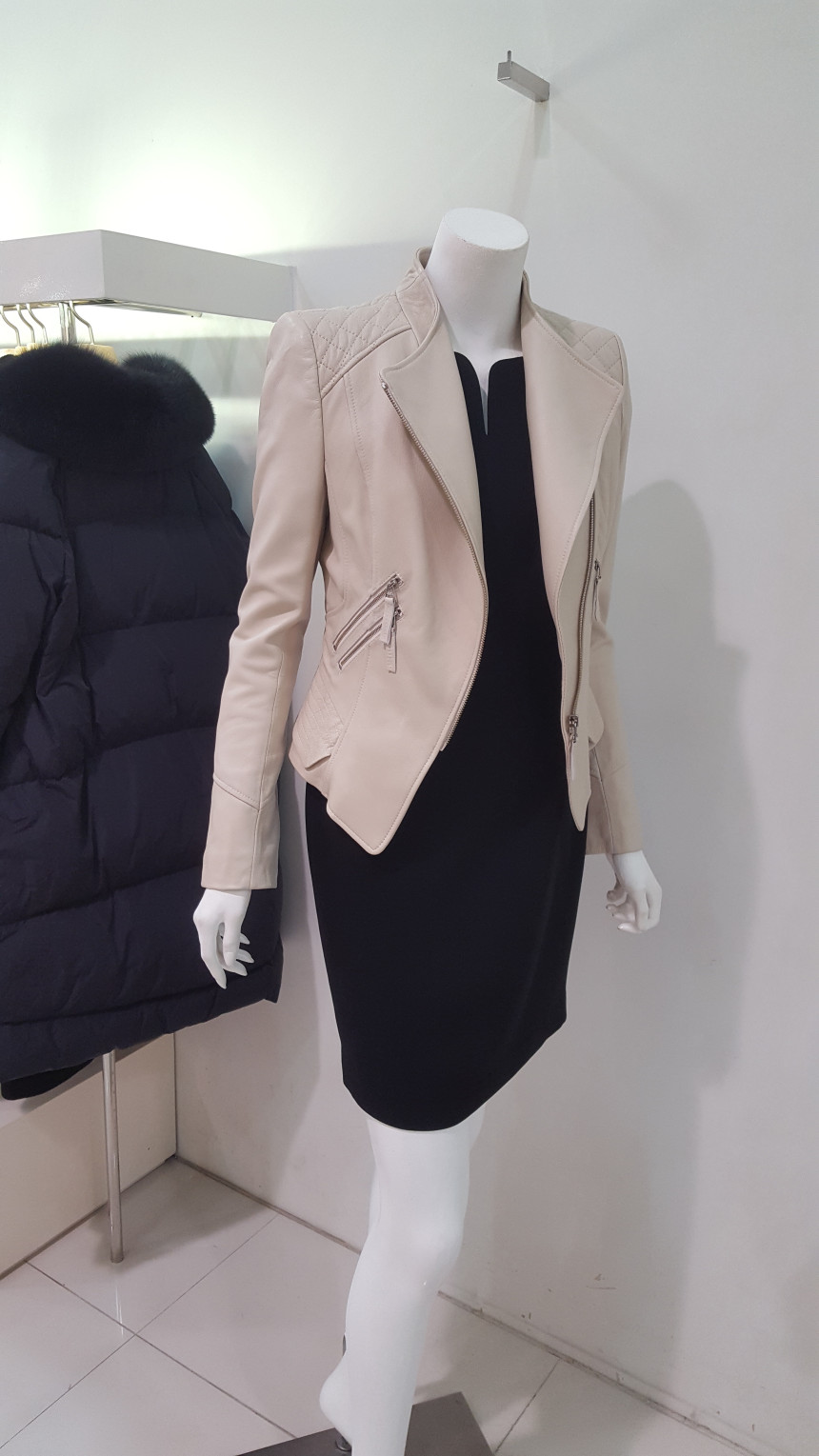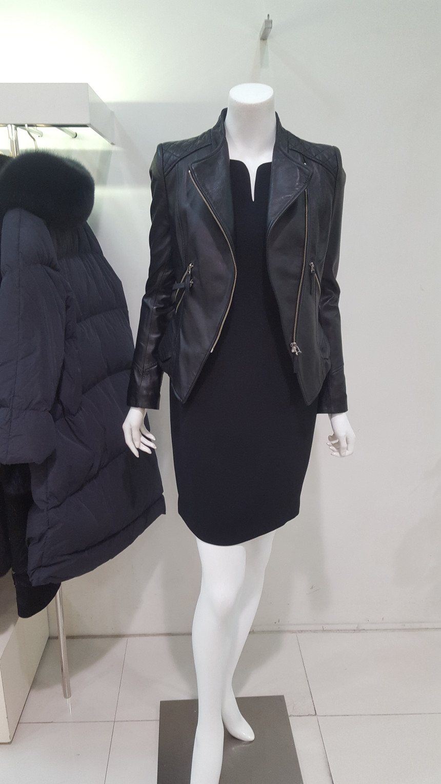 카라가 넓지 않는차이나 카라넥 스타일의 가죽 자킷으로여성스럽고 사선으로 떨어지는