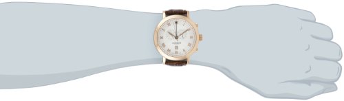 -. Feature : Silver-tone, embossed, inner dial surrounded by rose-tone, Roman numeral, hour markers / Chronograph features include 60 second and 30 minute timer sub dials; date window at the 6 o'clock position / Brown, genuine leather, strap / Swiss quartz movement / Water resistant to 330 feet (100 M): suitable for snorkeling, as well as swimming, but not diving