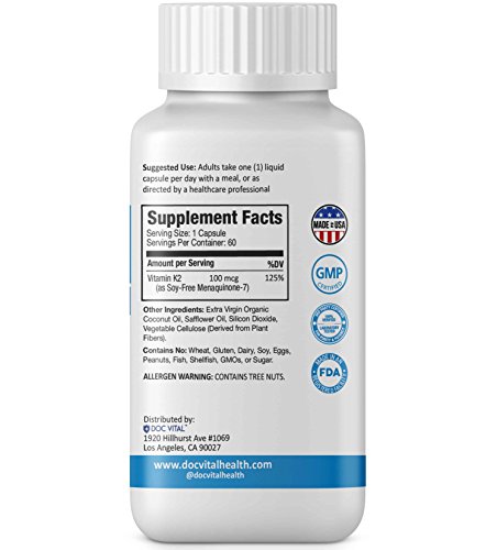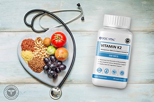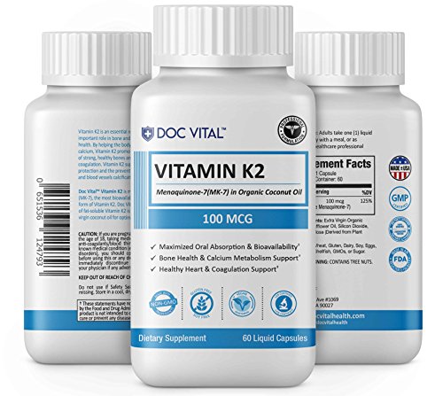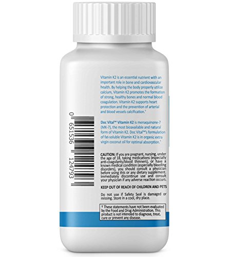 -. Feature : CARDIOVASCULAR AND BONE HEALTH SUPPORT: Vitamin K2 is an essential nutrient that supports bone and heart health. By helping the body properly utilize calcium, Vitamin K2 promotes the formation of strong, healthy bones and normal blood coagulation. Vitamin K2 supports heart protection and the prevention of arterial and blood vessels calcification.* / OPTIMAL DOSAGE OF PURE MENAQUINONE-7 (MK-7): With 100 mcg of Vitamin K2 as Menaquinone-7 (MK-7), our formulation provides the optimal daily dosage support of the most bioavailable form of Vitamin K2.* / MAXIMIZED ORAL ABSORPTION & BIOAVAILABILITY: Vitamin K2 is a nutritional fat soluble compund and difficult for the body to absorb. Our formulation of fat-soluble Vitamin K2 is in organic extra virgin coconut oil for optimal absorption. Note: Coconut Oil may appear "cloudy" inside the capsules.* / CLEAN FORMULATION: We use Extra Virgin ORGANIC Coconut Oil. Our product is also made with Non-GMO, Gluten-Free, Soy-Free, and Vegan ingredients. / QUALITY MANUFACTURING: Doc VitalTM Vitamin K-2 in Organic Coconut Oil is 100% verified, laboratory tested for purity and potency. Our professional formulation is made in the USA in an FDA Registered Facility.