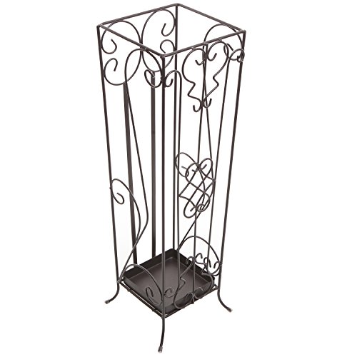 -. Feature : An ornate and functional umbrella drying storage rack made out of brown metal. / Boasts intricate metalwork accents throughout the frame as well as an uP.R.Ight stand-alone structure. / Keep in a corner in your entryway to make umbrellas easily accessible. / **Official MyGift® product.** / Approximate Dimensions (in inches): 21.25 H X 6 D.