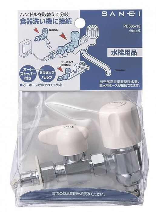 JIS規格のツーバルブ混合栓や単水栓の上部と交換して分岐。ノンライジングには使用できません。食器洗い機に送水。開閉操作が容易なセラミックバルブを採用。オートストッパー付。