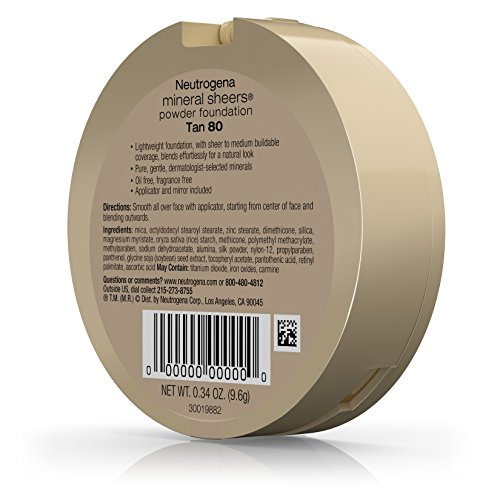 -. Binding : Health and Beauty -. Brand : Neutrogena -. EAN : 0086800005582 -. Feature : Mineral powder makeup in a compact / Helps provide sheer to medium coverage for a natural finish / Helps enhance skin clarity, tone, and texture and reduces redness / Lightweight and breathable formula / Dermatologist-selected minerals; SPF 20 sunscreen -. Label : Johnson & Johnson SLC (Cosmetics) -. Manufacturer : Johnson & Johnson SLC (Cosmetics) -. NumberOfItems : 1 -. PackageQuantity : 1 -. ProductGroup : Pantry -. ProductTypeName : BEAUTY -. Publisher : Johnson & Johnson SLC (Cosmetics) -. Studio : Johnson & Johnson SLC (Cosmetics) -. Title : Neutrogena Mineral Sheers Compact Powder Foundation Spf 20, Tan 80, .34 Oz. -. UPC : 086800005582