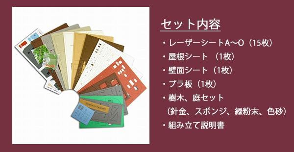 | セット内容 | レーザーシートA~O(15枚) 屋根シート (1枚) 壁面シート(1枚) プラ板(1枚) 樹木・庭セット(針金、スポンジ、緑粉末、色砂) 組み立て説明書 |