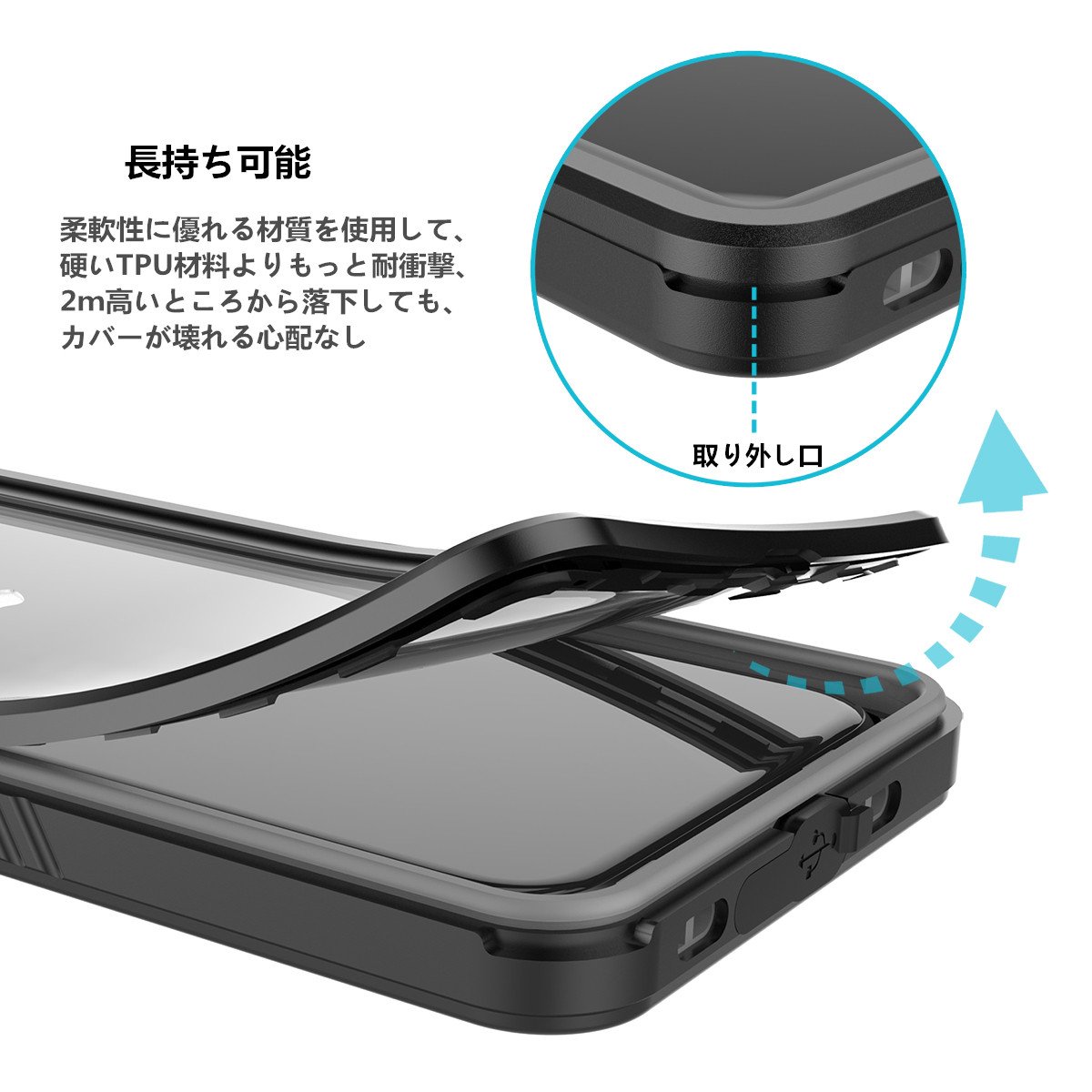 The back part adopts TPU material excellent in flexibility and it is more impact resistant than the case of hard TPU material, for example, if it falls from a high point of 2 cm, the hard material tends to rupture, our products worry this