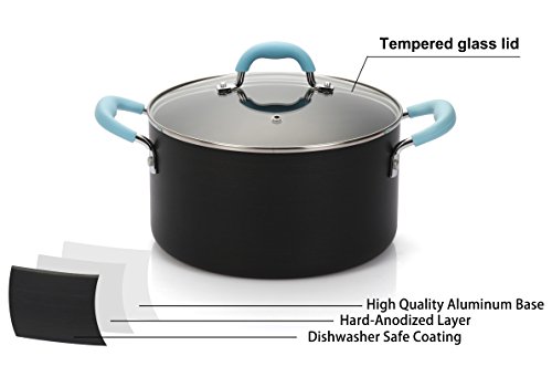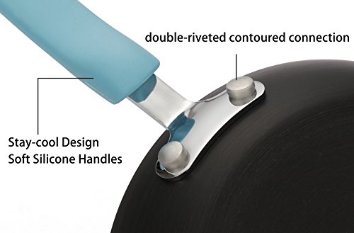 Stay-cool design soft silicone handles which used double-riveted contoured connection to keep handles sturdy and cool. Tempered glass lids keep the cookware visible while cooking