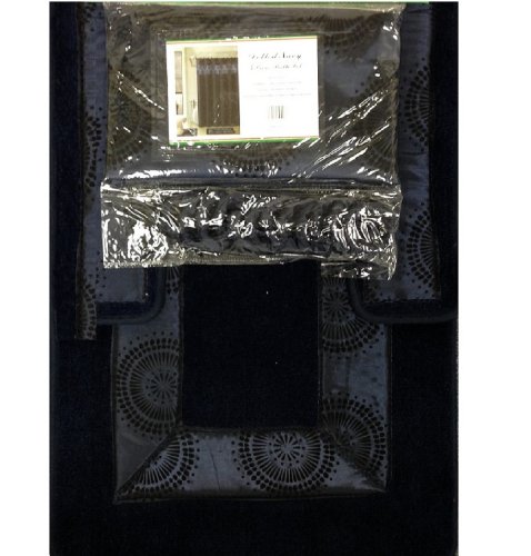 -. Title : 4 Piece Luxury Navy Blue Bath Rug Set/ 3 Piece Bathroom Rugs with Fabric Shower Curtain and Matching Rings