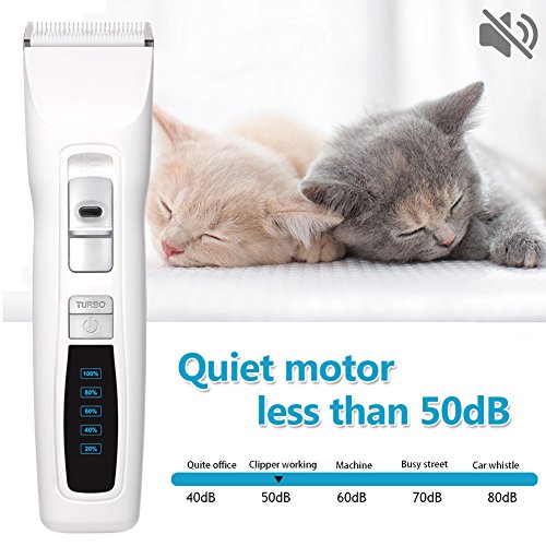 Main Features of Cyrico New Generation Pet Hair Clipper ?2-Speed Turbo Function-5500/6500RPM powerful motor for thick coats animal. ?Rechargeable cordless design-cordless and cord use both available. ?Built in Li-ion Battery-3hrs charge with 300 minutes long time power supply, perfect for long time grooming work. ?Blade with adjustable 3 sizes-1.3mm/1.6mm/1.9mm ?Germany imported motor-quiet enough not to scare dogs and cats. ?Ceramic and stainless steel blade-generating less heat after long time working. ?LED charge indication of power use to better control the grooming process. ?Novelty white color design, perfect as gift for your friends and families.