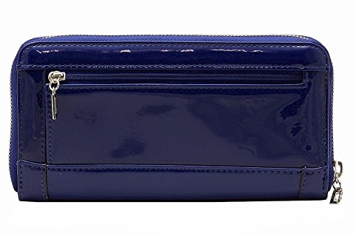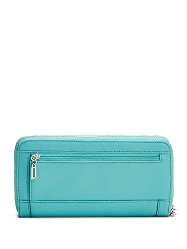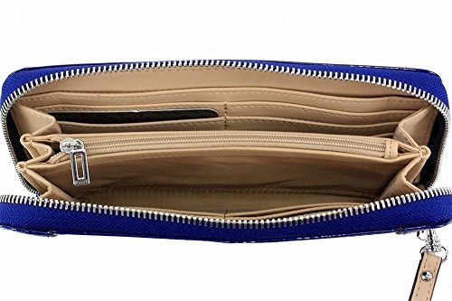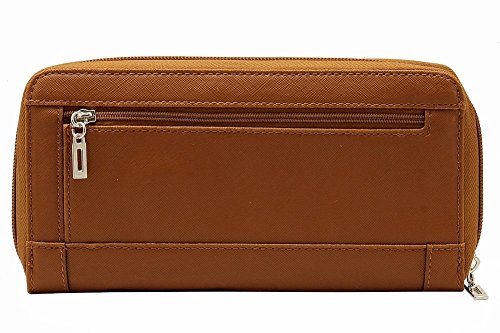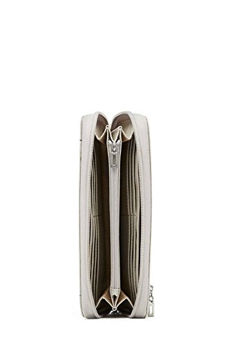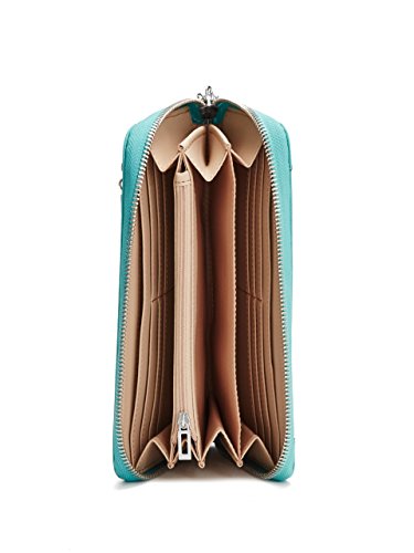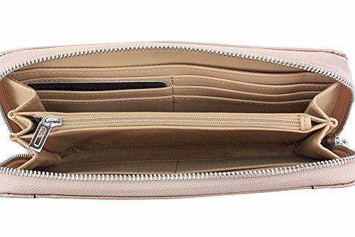 - Feature : Metallic saffiano-textured faux-leather exterior. Silver-tone hardware. / Front logo emblem. Zip-around closure. / Divided interior with 12 credit card slots and 2 bill pockets / Interior and exterior zipper pockets / Removable wristlet strap with 6.75" drop