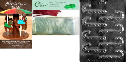 Cybrtrayd Small Candy Canes Chocolate Mold with Chocolatier's Bundle of 25 Cello Bags, 25 Red Twist Ties and Chocolatier's Guide
