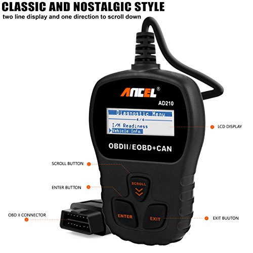 -. Feature : Latest design, well made and exclusive dealing! Scan codes much faster than ANY Bluetooth or WiFi obd2 scanners. / Works on MOST 1996 US-Based, 2000 EU-Based and Asian cars, and newer OBD II & CAN domestic or import vehicles. Supports English, German, French, Spanish, Portuguese and Russian. / Super easy to use! Once plugged into your vehicle's 16pin OBDII DLC, the unit will power up and prompt you to start your ignition. No need any Batteries or Charger, gets the power directly from the OBDII Data Link Connector in your vehicle, and you have the menu to read and erase error codes. / I/M monitor readiness test, turn off the MIL (check engine light). Read hard (memory), pending (intermittent), historic codes and show definitions. Retrieves vehicle information (VIN, CIN and CVN). / Ancel AD210 code reader is well built with a high brightness LCD display (128 x 32 pixel) that has white backlight and contrast adjustment, indicates test results. It already has the database for the descriptions and not just the codes, saves your time from looking the codes up on the internet or from manuals. Two Years Warranty Guarantee.