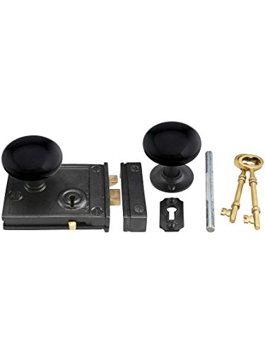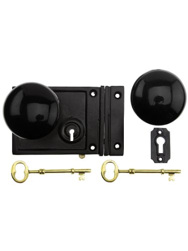 -. Title : Cast Iron Horizontal Rim Lock Set With Black Porcelain Door Knobs. Antique Cast Iron Lock Set.
