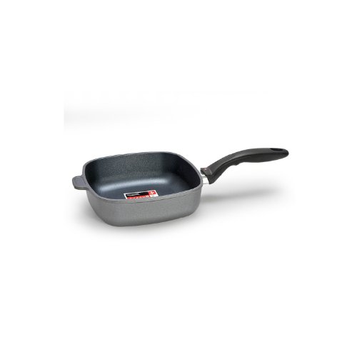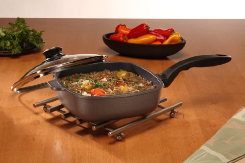 The Swiss Diamond 20x20 cm (8” x 8”) square saute pan sears cube steak like stainless steel without the messy clean-up. Sautee or steam vegetables under the tempered glass lid with adjustable steam vent. Make fried rice without the fried: our nonstick coating is so slippery that no oil or butter is needed - use only low to medium-high heat to prevent sticking. Although the pan itself is square, the accurately trimmed bottom is round to fit a standard stove eye, and its cast aluminum construction ensures that even corner areas that do not touch the stove receive equal heat. The included tempered glass lid allows you to monitor food without lifting the cover, maintaining flavor and keeping food from drying out. The rotating lid knob opens or closes a steam vent to release or contain moisture as needed. Used by discerning home chefs around the world, Swiss Diamond’s PFOA-free cookware features unsurpassed nonstick performance for healthy cooking and easy clean-up. The patented nonstick coating, reinforced with real diamond particles, allows oil-free cooking and cleans up with just warm soapy water. No more scrubbing and soaking! Swiss Diamond’s patented nonstick coating is reinforced with real diamonds for excellent durability and resilience. Why diamonds? Three reasons: they are durable, they are naturally nonstick, and they conduct heat better than any metal. A perfect combination for a lifetime of cooking excellence. Swiss quality is visible in every aspect of Swiss Diamond cookware. Heavy-duty cast aluminum will never warp, while the perfectly flat base distributes heat evenly and will not tip or spin. The rivet-free interior prevents unsightly food build-up that can lead to bacterial growth. The ergonomic handle, designed for comfort and balance, stays cool on the stovetop. All Swiss Diamond products are oven-safe up to 500 degrees F (260 degrees C) and suitable for use on gas and electric cooktops – induction series sold separately. Made in Switzerland with an eco-friendly production process.Feature