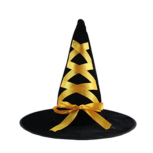 -. Feature : Trade name:Bandage black witch hat / Product material:Flannelette,non-woven / Product size:height 38cm/15",hat mouth diameter 19cm/7.5",brim diameter 41cm/16" / A variety of styles available,adults and children all can wear. / Suitable for Halloween,bar,KTV,party to wear,to add the festive atmosphere.