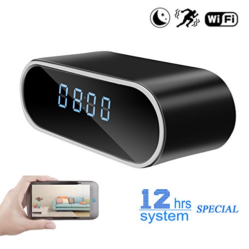 -. Feature : 12 Hour System: Specially customized 12-hour system which is easier to read time than 24 hour system. / Wifi Clock Camera:It is a simple table clock with a HD hidden camera built-in,nobody will realized this is a spy hidden camera,you can see exactly what happened when you were not in your home,office,business,or any need a secret safe place. / Motion Detection: Alarming Notifications will be transferred to your Smartphone when the motion detection is activated,and it will record at the same time. / Night Vison: The hidden clock camera work well at night.It won't miss any moment.IR night vision goes better when the unit is being charged, but these special IR lights are totally invisible to the human eye. / 1080P HD: The video resolution 1920 x 1080P,you can see exactly what's going on through video.Included 2000 mAh rechargeable battery.
