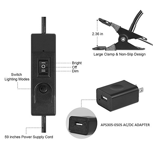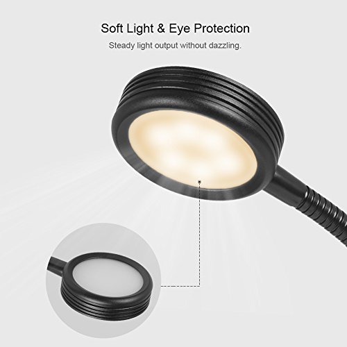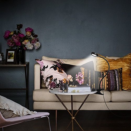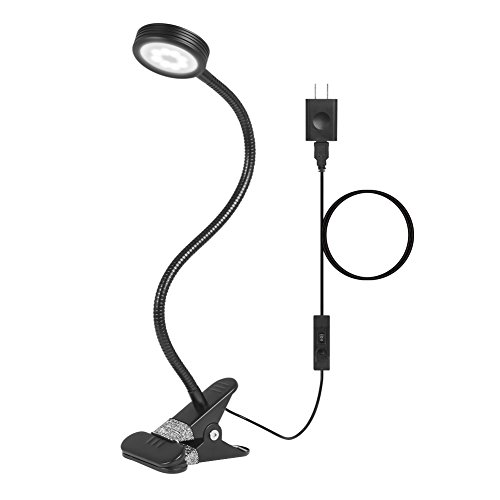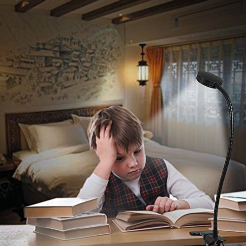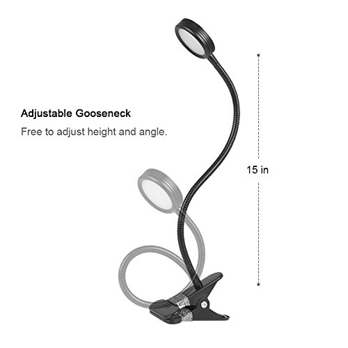 Kootek clip on light features a bendy gooseneck design and multiple light settings (altogether 6 different combinations), the clip is covered by rubbery pad which can prevent scratching, allowing you to clip the light almost anywhere you want sturdily. The clamp can be stretched up to 2.36 inches and the clip takes up little space in your work area, so it can easily be used as a worklight, a book light, a study light, or a table lamp, which can meet the needs for lighting of most people.