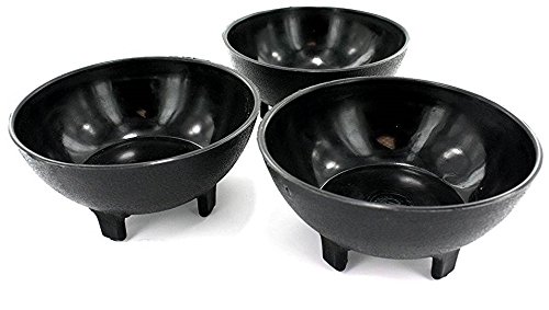 3-piece Salsa Bowls Set features black bowls made of durable plastic with four legs for balance. Each bowl measures approximately 5" wide with a depth of 1 3/4" and can hold up to 12 ounces.
