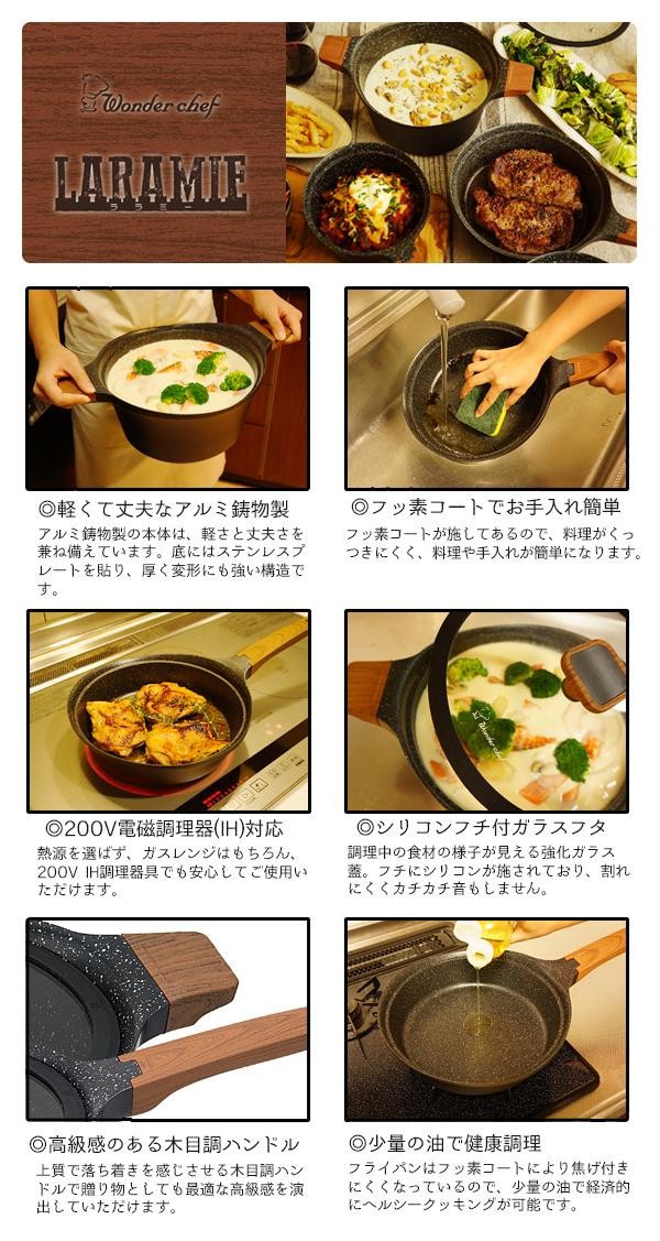 | 軽さと丈夫さを兼ね備えたアルミ鋳物製にフッ素コー トを施しました。調理やお手入れも簡単♪ |