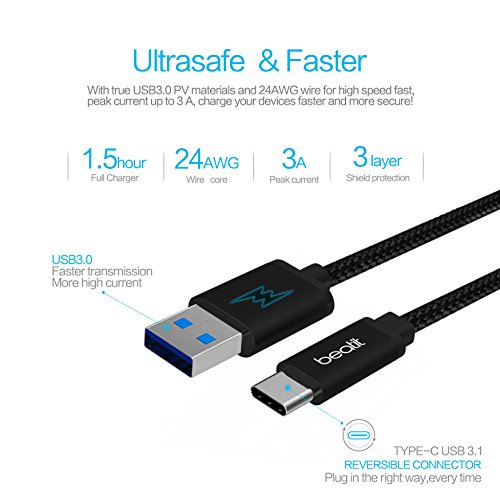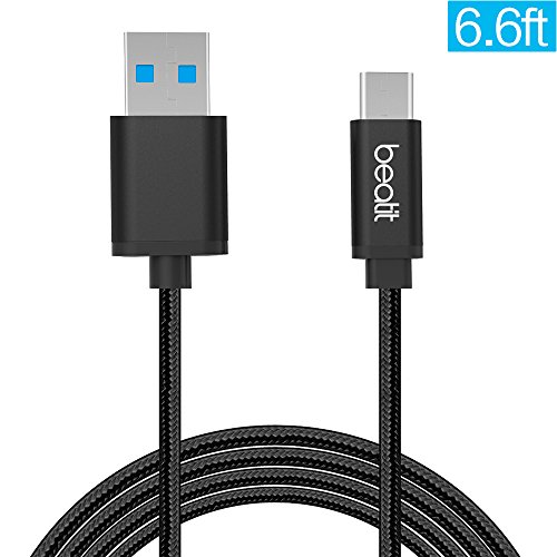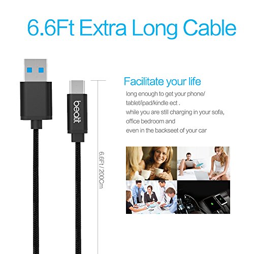 BEATIT TECH USB Type C Cable Nylon Braided USB C Cable Quick Charge and Data Sync 3.0A Current Full Speed USB C To USB 3.0 With Reversible Connector (Black 6.6ft)