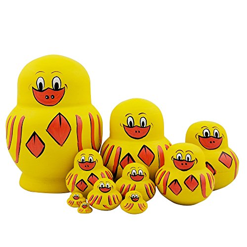 -. Feature : Cute Colorful Duck Russian Nesting Dolls Set, Set of 10, made of basswood, nice quality / Hand Painted with Environmentally friendly paints,nice details and nice craft,very easily to open / Cute yellow duck painting, all are painted by hand,not smelly and Environmentally friendly / Kids nice toys and they will make your kids happy and satisfied / Package included: Set of 10 Colorful Girl Russian Nesting Dolls