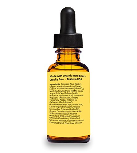 - INGREDIENTS: Deionized Aqua (Water), Organic Aloe Barbadensis Leaf (Aloe), Sodium Ascorbyl Phosphate (Vitamin C). Methylsulfonylmethane (MSM), Cassia Angustifolia Seed Polysaccharide (Botanical Hyaluronic Acid), Hamamelis Virginiana (Witch Hazel), d-Alpha Tocopheryl Acetate (Vitamin E), Carbomer, (2s)-2-Amino-5-Guanidinopentanoic Acid, Ferulic Acid, Kosher Vegetable Glycerin, Organic Simmondsia Chinensis (Jojoba Oil), Organic Centella Asiatica (Gotu Kola), Wildcrafted Taraxacum Officinale (Dandelion), Wildcrafted Geranium Maculatum (Wild Geranium), Phenoxyethanol, Ethyl Hexyl Glycerin.