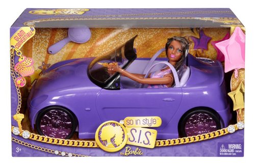 Barbie So In Style Doll and Convertible Gift Set: Every girl dreams of getting a car for her 16th birthday, and this purple convertible is one hot ride. Holofoil lights, an S.I.S. license plate and shiny, purple hubcaps make a stylish statement, while the doll in her matching dress with glittery accents and a gold car key looks just as fabulous. Rolling wheels, a turning steering wheel and seatbelts add realism to role play. Includes S.I.S. Purple Convertible and doll. Barbie So In Style Convertible and doll set is great for any gift.