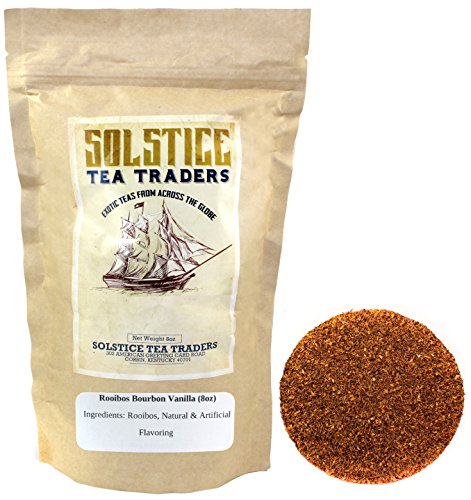 -. Binding : Misc. -. Brand : Solstice Tea Traders -. EAN : 0651174996691 -. Feature : DELICIOUS CAFFEINE FREE HERBAL ROOIBOS TEA INFUSED WITH BOURBON VANILLA- Bourbon vanilla compliments herbal rooibos red tea in a wonderful way, a creamy vanilla thats naturally sweet without added calories of sugar / VANILLA ROOIBOS-A great way to experience a new twist on a traditional tea, by adding vanilla flavor we take an old favorite like herbal rooibos and add a new age twist / LARGE 8oz BAG OF VANILLA ROOIBOS-A large half pound bag of herbal vanilla rooibos tea, each bag makes approx. 85 cups of tea / SMALL BATCH HAND PACKED BY ARTISANS-Hand packed in small batches by master artisans, this vanilla rooibos is a great drink day or night, hot or iced -. IsAdultProduct : 0 -. Label : Solstice Tea Traders -. Manufacturer : Solstice Tea Traders -. PackageQuantity : 1 -. ProductGroup : Grocery -. ProductTypeName : GROCERY -. Publisher : Solstice Tea Traders -. Size : 8 Ounces -. Studio : Solstice Tea Traders -. Title : Rooibos Bourbon Vanilla Tea, Loose Leaf Rooibos Bourbon Vanilla Tea, 8 ounce Loose Leaf Tea, Rooibos Bourbon -. UPC : 651174996691
