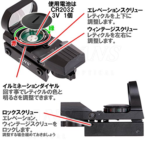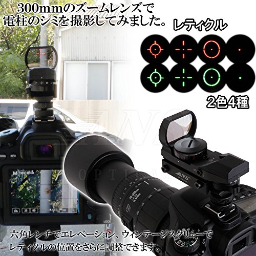 -. Feature : ANS Optical社の、JH400タイプドットサイト、各社のカメラのホットシューに対応したマウントアダプターのセット品です。 / レティクルのタイプは4種類切り替え可能。イルミネート色はレッドまたはグリーンに切り替え可能。輝度の調節もできます。レンズはハーフミラーコートティングレンズを使用しております。(全くの透明ではドットを投射できないため、少し色がついているように見えます。) / ドットサイトとマウントの合計重量は超軽量の143g。(個体差があります。)ホットシューを搭載したコンパクトデジタルカメラにもおすすめ。 / 素晴らしい一瞬を写真におさめるにはスピードが命です。照準器を通して素早く被写体をとらえることで、高速シャッターが武器のデジタル一眼レフカメラの能力を最大限まで発揮します。 / 電池別売です。(CR2032ボタン電池1個使用) マウント部からレンズ中央まで(視線の高さ) 約 3cm