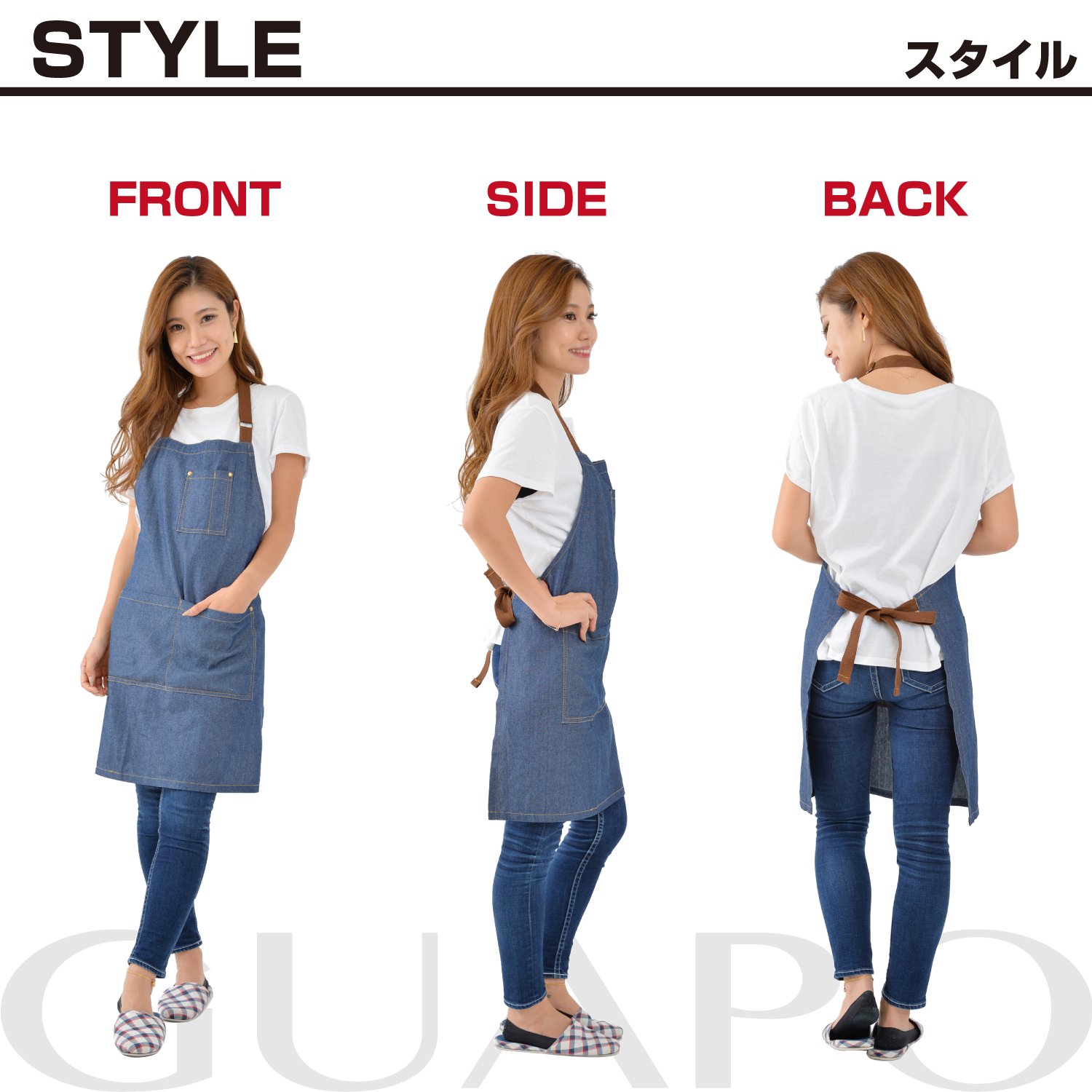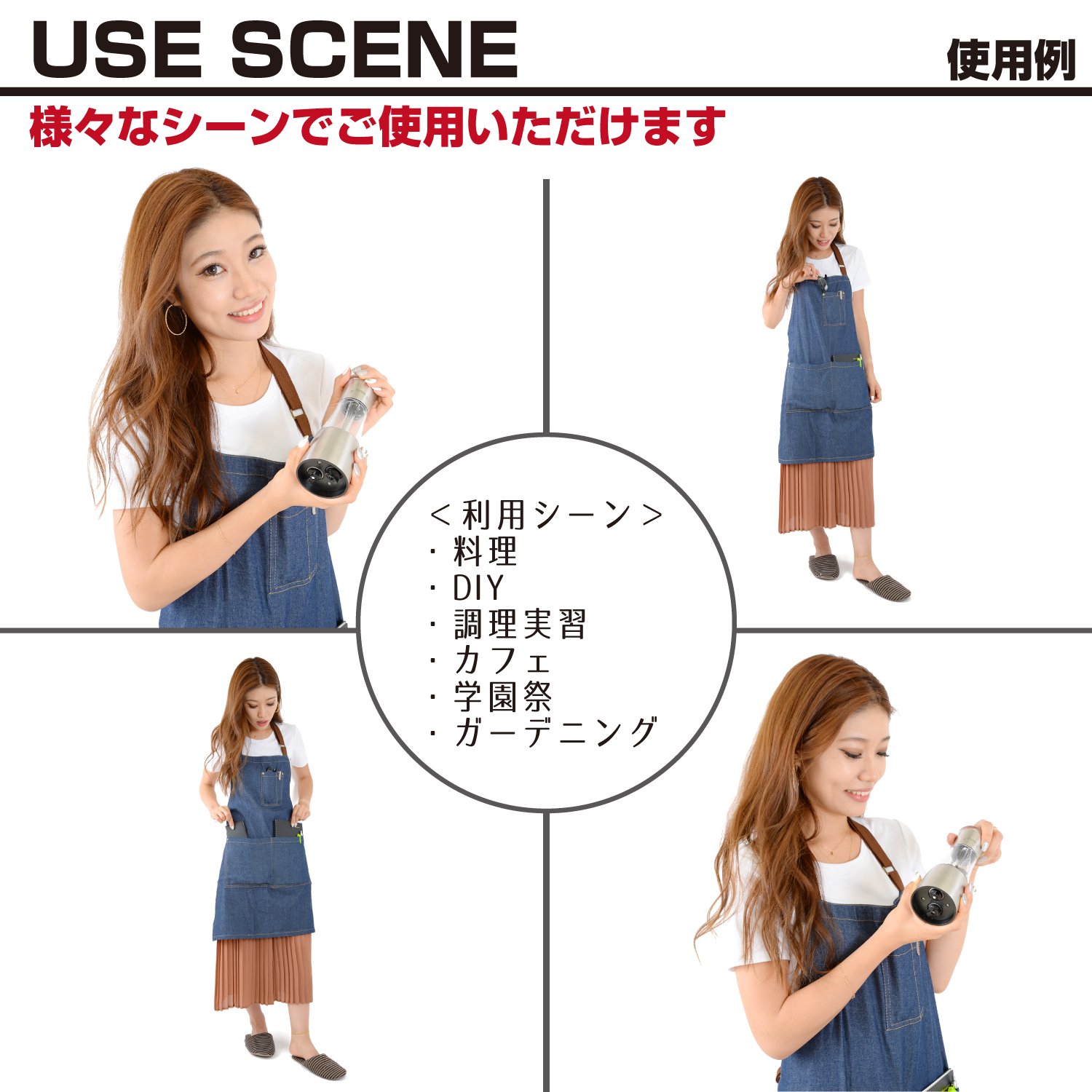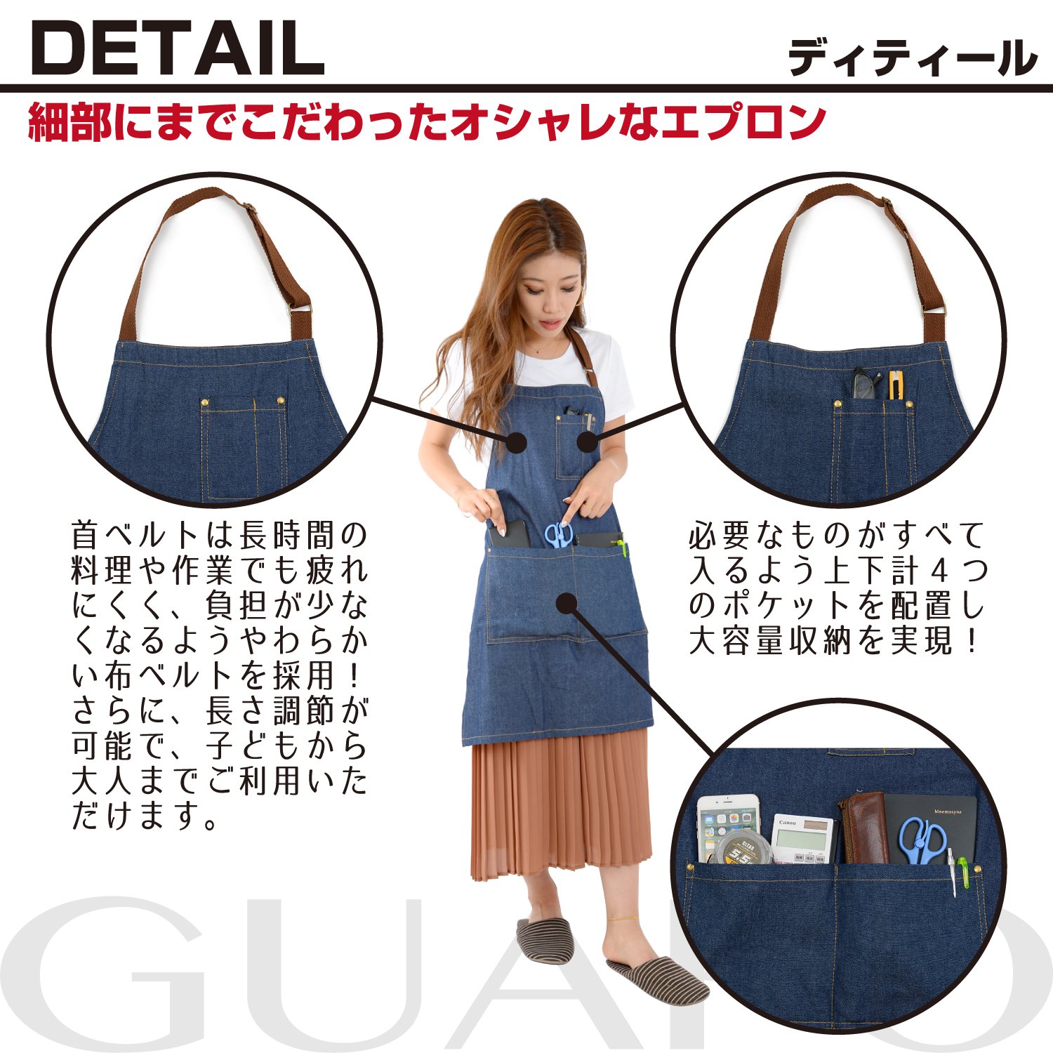 Since women want cooking and gardening, men use DIY, and children use in many scenes such as cooking practice and school festival, in order to correspond to every scene, there are two pockets where pen and cutter knife etc. are easy to put in chest