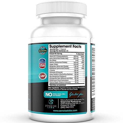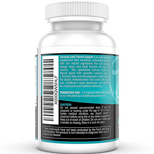 -. Feature : For a Healthier Thyroid - Zenwise Labs Thyroid Support is an extra-strength dietary supplement that promotes overall thyroid wellness for men and women with natural ingredients which include Vitamin B12, Iodine, Zinc, L-Tyrosine, Ashwagandha, Kelp and more. / Weight Management Support - This specialized formula utilizes L-Tyrosine, Kelp and Ashwagandha Root to supply the thyroid gland with invaluable nutrients that can optimize metabolism to assist in weight loss. / Achieve an Energetic Well-Being - This supplement assists those with underactive thyroids who may suffer from fatigue, insufficient sleep, depression and a lack of alertness by instilling the body with an optimized boost of energy that awakens and balances the body and mind. / A Supplement You Can Trust: Our FDA-registered facility is NSF and GMP certified, and all of our products are manufactured in the USA.