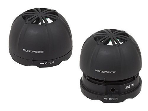 Share your mobile music or videos and get great quality stereo sound in the palm of your hand with These Mini Rechargeable Portable Speakers from Monoprice!