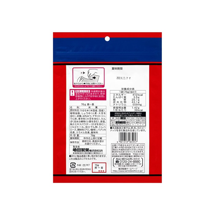 원재료:멥쌀 미(미국산,국산)고, 식물성 기름지,간장(밀 대두를 포함한다)고, 설탕,벌꿀,덱스트린,나오지 않겠 분,향신료(대두를 포함한다)고, 담백 가수분해물(밀을 포함한다)고, 식염,생선 및 조개류 엑기스 파우더(하면을 포함한다)고, 솔《비토루》,가공 나오지 않겠 분,트레이닝 헬로《스》,조미료(아미노산등)고, 파프리카 색소,카라멜 색소,신맛료