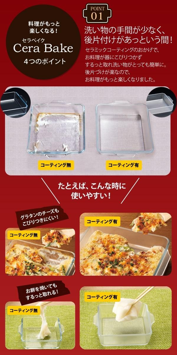 セラミックコーティングのおかげで、お料理が器にこびりつかず、クッキングシートを敷いたり、バターを塗ったりする工程が省略可能です。エコでヘルシー、しかも時間短縮できます。シンプルなデザインで、ほかの食器とも合うので、食卓にそのまま出しても様になります。 |