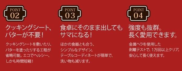| セラミックコーティングのおかげで、お料理が器にこびりつかず、クッキングシートを敷いたり、バターを塗ったりする工程が省略可能です。エコでヘルシー、しかも時間短縮できます。シンプルなデザインで、ほかの食器とも合うので、食卓にそのまま出しても様になります。 |