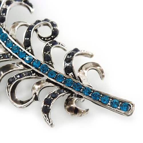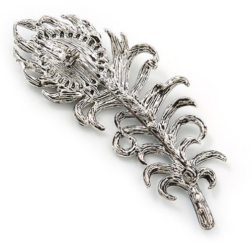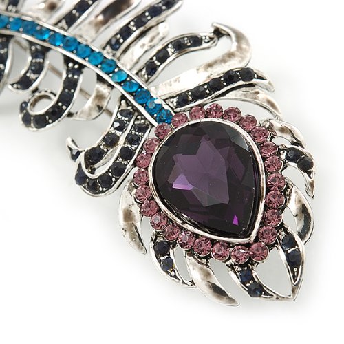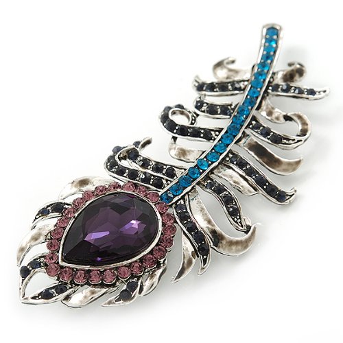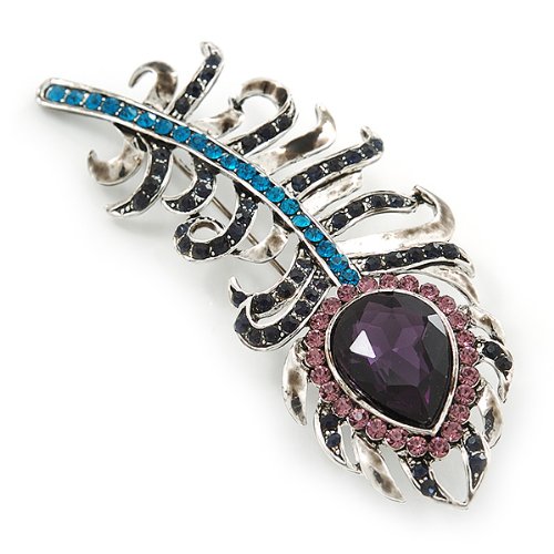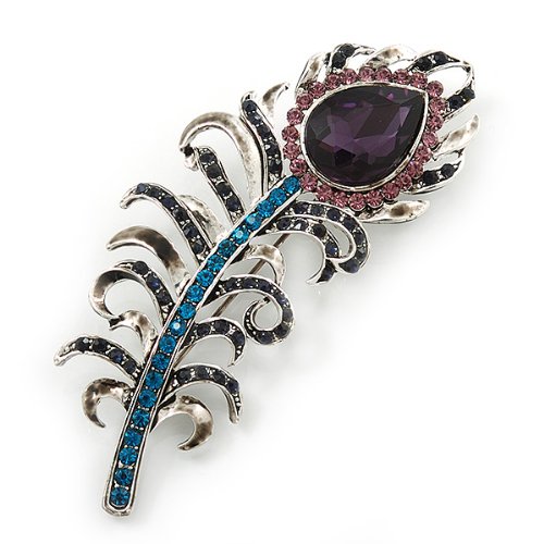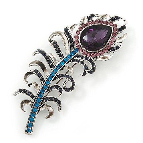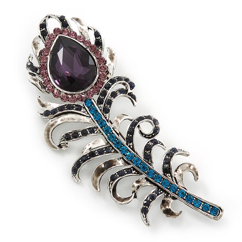 Escape to a world where fantasy reigns. This whimsical design displays a sparkling array of colourful crystals that add a bold confidence to your favourite looks. Featuring a large peacock feather design, crafted in rhodium plated metal and encrusted with a teardrop shaped violet Cz and Swarovski crystals in hues of teal, dark blue and purple. It measures about 80mm x 28mm and secures with a flag pin and revolver clasp. Fantastic gift idea - Christmas, birthday, anniversary, mothers day, etc. Easily fastens to any bag, hat, coat or jacket.Feature