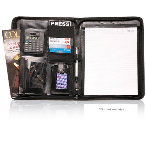 - Feature : Zippered Closure, Sewn Black Stripe / Calculator, Zippered Pocket / Mobile Phone Pocket, Card Pocket, / Pen Loop (Pen not included), 30 Page Ruled Memo Pad / 10.25" W x 13.25" H