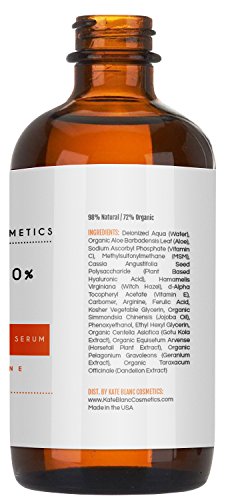 Kate Blanc's Vitamin C Serum is 98% Natural and is made with hyaluronic acid, Vitamin E, Aloe Vera, and Green Tea. It softens and replenishes moisture in your face, balance your skin's pH level, and absorbs oil.