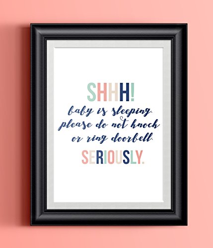 This fun sleeping baby sign featuring the words "SHHH! Baby Is Sleeping. Please Do Not Knock or Ring Doorbell. SERIOUSLY." is printed on 8.5 x 11 110 lb cardstock with high quality archival inks to insure this gorgeous print never fades *Please note: These prints are on 8.5x11 110lb cardstock, but are designed to be trimmed down for an 8x10 frame, if you wish to frame them. Frame is not included.*