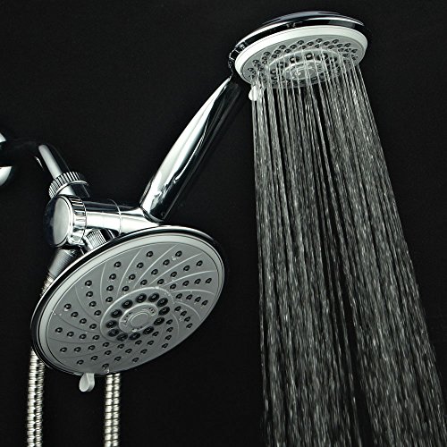 Dual Shower Head System Includes a 6-setting 6 inch Rain Shower Head, 6-setting 4 inch Handheld Shower, Patented 3-way Water Diverter with Anti-swivel Lock Nut, Angle-adjustable Overhead Bracket, 5 Foot Stainless Steel Shower Hose and Plumber's Tape