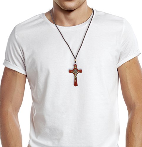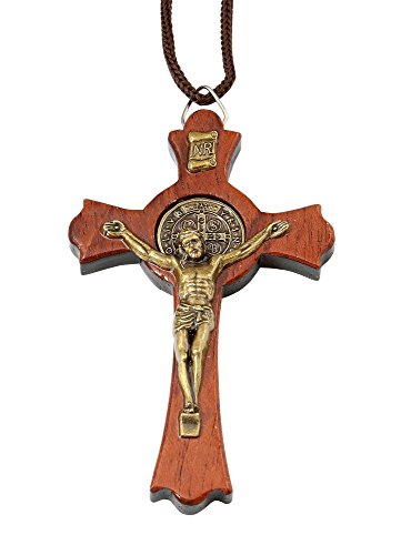 -. Title : Saint Benedict Wooden Gold Tone Cross Crucifix Pendant Necklace, 3.54" Cross, X-Large