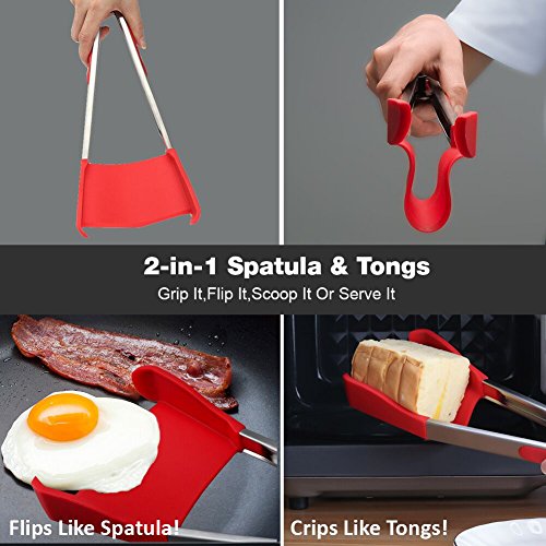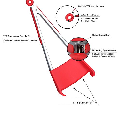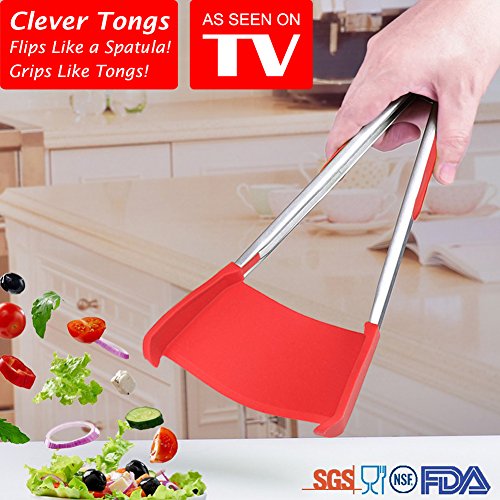 Clever Tongs 2 in 1 Silicone Spatula and Tongs Kitchen Tools As Seen on TV 12'' Food Spatula and Tongs with Locking Clip,Stainless Steel Frame,BBQ Tongs Non-stick,Heat Resistant and Dishwasher Safe