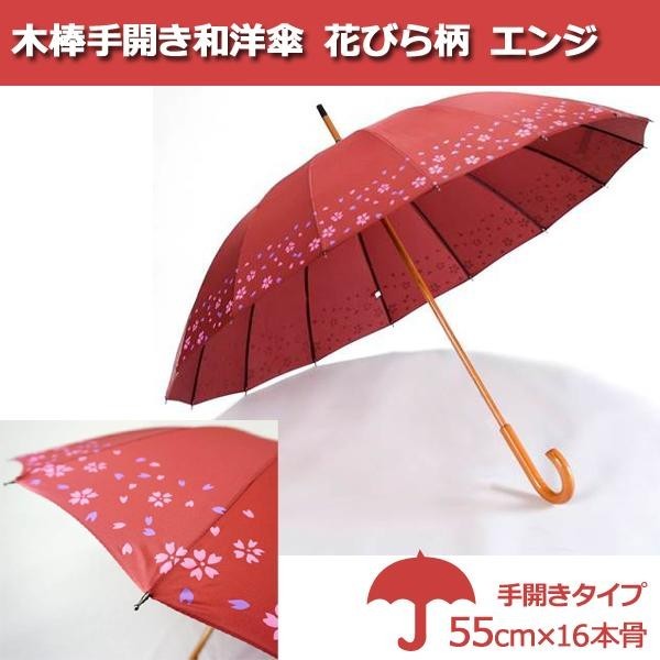 花びらの模様と16本骨のエレガントなフォームがマッチした木棒・手開きタイプの傘です。鮮やかなエンジ色も、優雅さを際立たせてくれます。 |