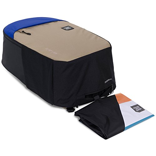 Ripstop rain cover with hidden zippered storage sleeve.