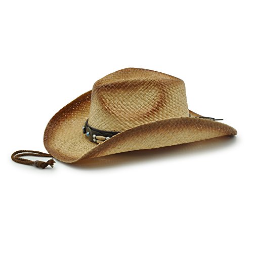 - Texan 2 is made of 100% raffia cowboy style hat. Offering one size fits most 3.5" rim with leather colored yarn conch
