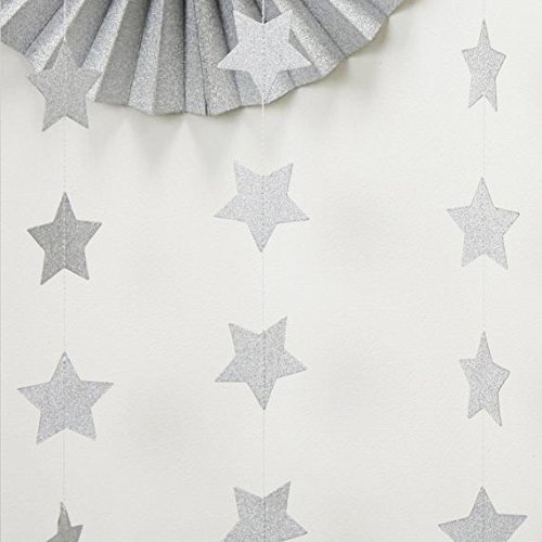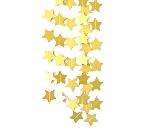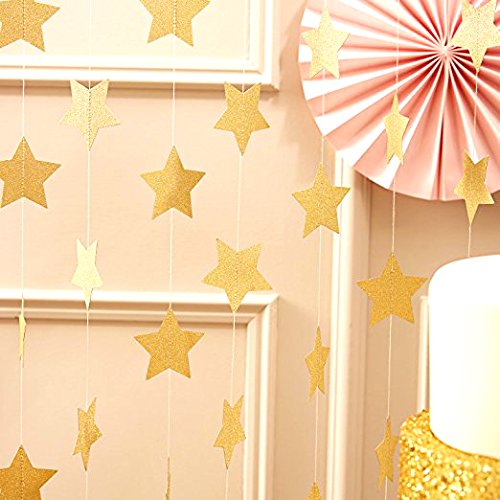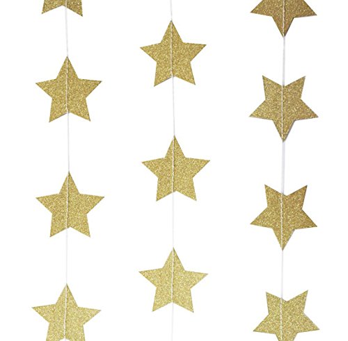 Package includes: 2 pcs Twinkle Star Paper Garlands of the color as the photo shows.Each string is about 6.6 feet long.Suggest gold and silver to best show the theme and atmosphere of your party.