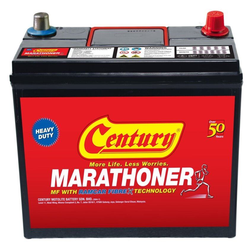 Century Marathoner  Century Marathoner is a heavier duty MF Battery compared to ordinary MF batteries, as a result of the addition of more active material and utilization of thicker grids. The additional active materials enable the plates to produce more power under an optimized material utilization rate while the mechanical properties of the plate is enhanced by the new design and thicker grids; ensuring that plates have a higher corrosion resistance. Better Grid Design Century Marathoner utilizes the tried and tested Expanded Positive and negative Lead-Calcium-Tin Alloy Grids, that allow the grids of the plates to have finer grain structure vs cast grids. The finer grain structure minimizes the sulfuric acid’s ability to corrode the “hollow spaces in the grid structure” and the result is a longer testing grid / longer battery service life.  Low Water Consumption Rate Thanks to its Lead Calcium-Tin alloy & Labyrinth design and gas liquid recombination cover; the Marathoner has a lower water loss and achieves a longer service life. RAMCAR FIBREX TECHNOLOGY It enhances the cohesiveness of active material components and allow active material compounds to freely expand. It enables contracts to its maximum during the charging and discharging process without breaking the bonds holding them together. This results in a more complete reaction of the active materials and acid; generating higher and consistent power.  Vibration Pads The Vibration pads act like ‘plastic springs” that are placed inside each cell of the battery, ensuring tighter element fit, resulting to higher vibration resistance.  Strap Protection The strap protector serves as “shields” in the event that the plates experience vertical grid growth and preventing the grid and other battery parts to short circuit.