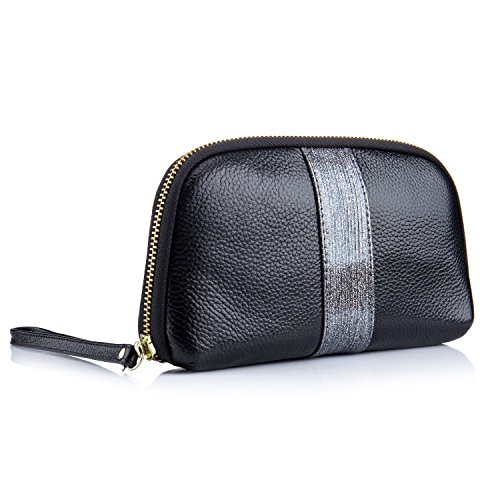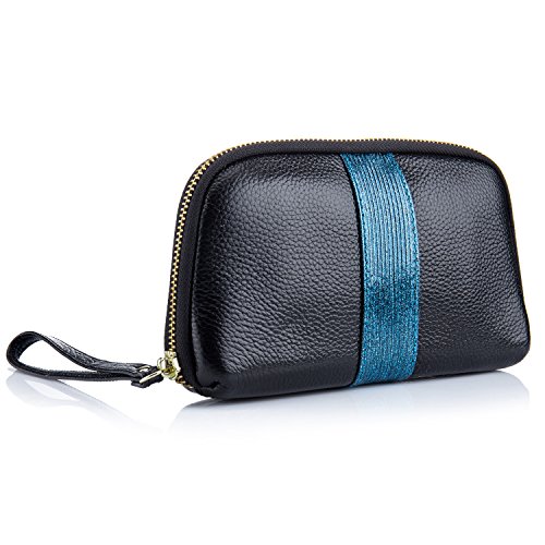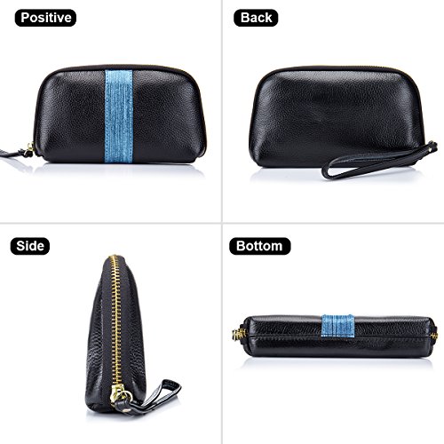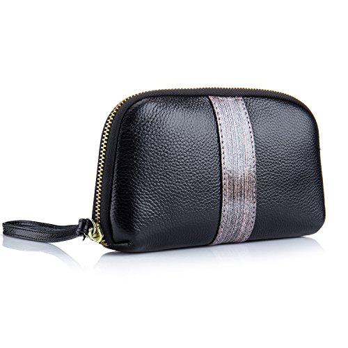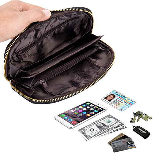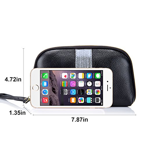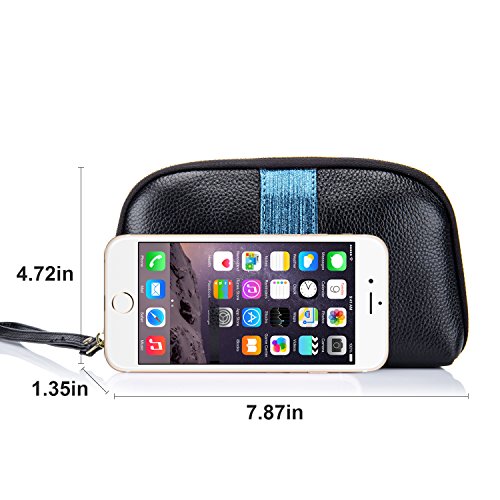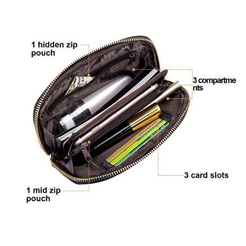 -. Feature : ✔ Dimensions: 7.87 * 4.72 * 1.35 inches(L*H*W), A little smaller than an iPad Mini tablets, can Hold All smartphones UNDER 5.7 inch / ✔ UPDATED VERSION: 4 compartments for smartphones, lipsticks, checkbooks, makeups, coins, etc + 2 zip pockets + 3 card slots / ✔ Material: Soft cowhide leather with lichee pattern, polyester lining, smooth, wonderful touching / ✔ Gold tone hardware and zippers / ✔ Clutch Wristlet - Long clutch strap as the zipper pull, you can use it as a wrist wallet