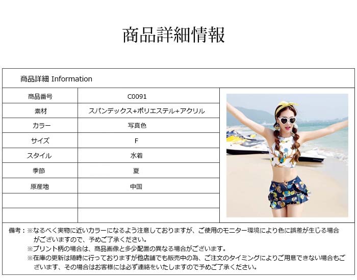 華やかでキュートなセパレートタイプ!夏らしい、鮮やかで女の子らしい色合いでガーリーな印象に!ビーチはもちろんタウン使いもできちゃいます■素材:スパンデックス+ポリエステル+アクリル■カラー:写真色■サイズ:FREE■原産地:中国