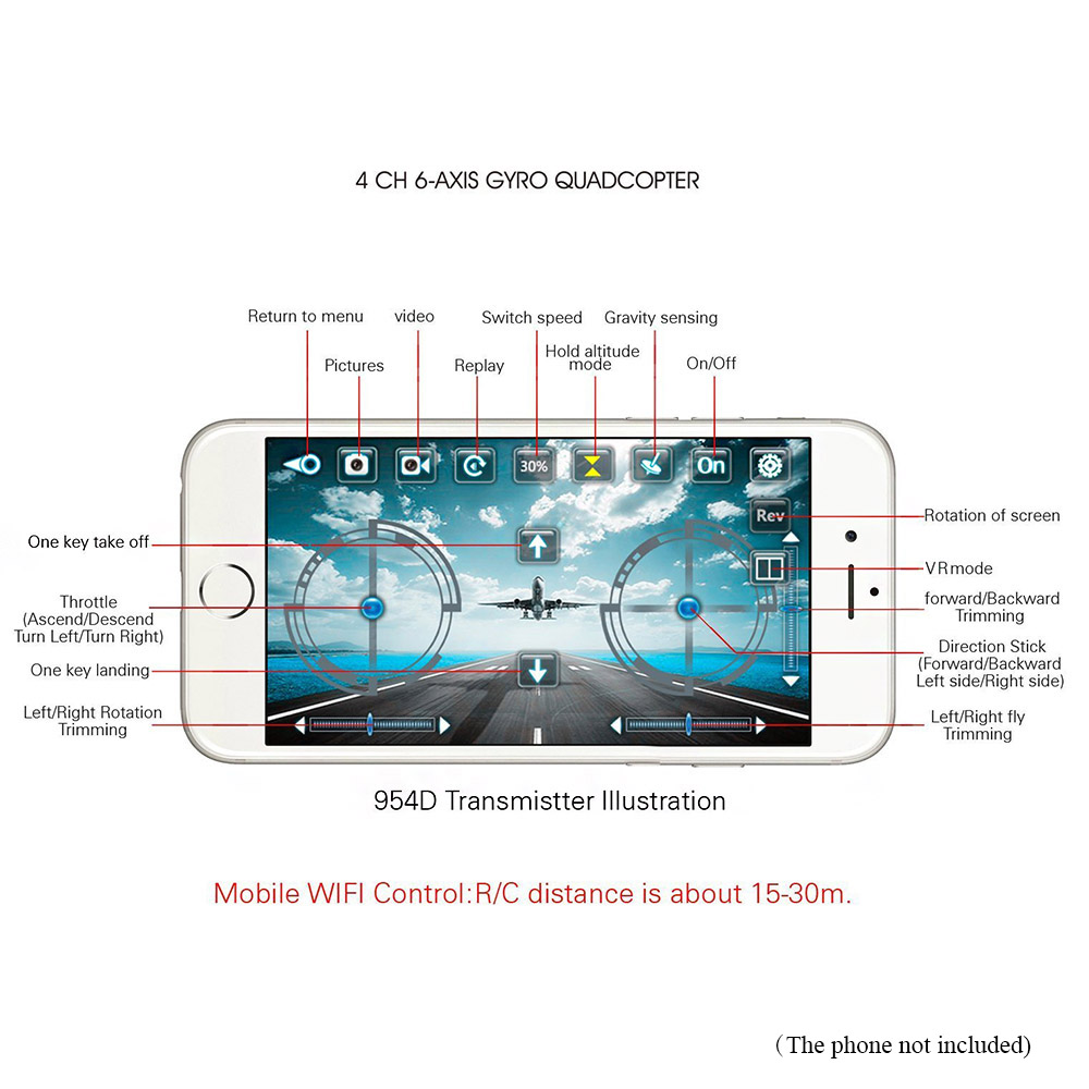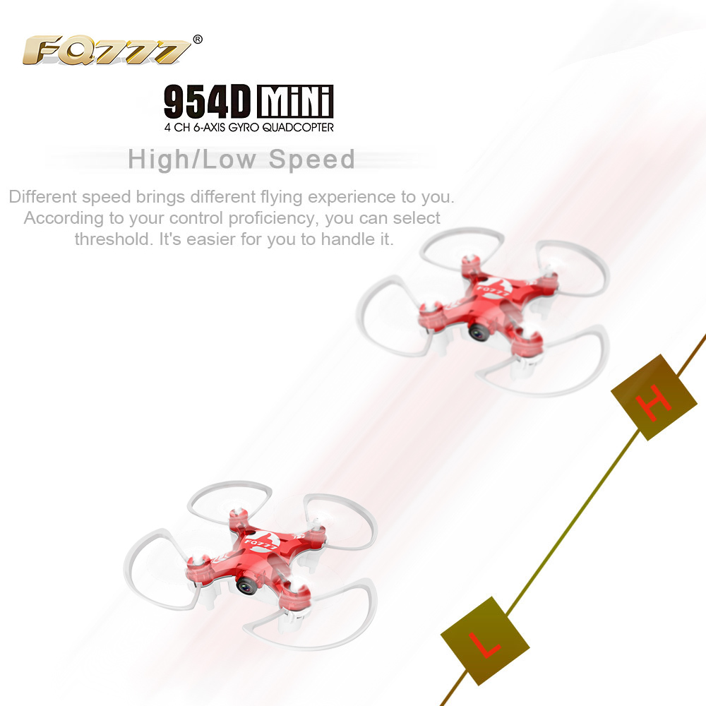 The FQ777 954D mini RC quadcopter WiFi FPV with 0.3MP camera doesn't need an extra transmitter. With WiFi real-time transmission, you can easily control it via the app on your cellphone. The FQ777 954D is built with a 0.3MP camera, allowing you to have a great first-person view as well as take pictures and record videos. Though in a small size, this newly designed RC quadcopter is capable of rising, falling, hover, flying forward and backward, flying sideward, turning. Don't miss out!