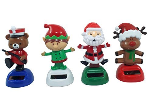 -. Binding : Toy -. Brand : Greenbrier -. EAN : 0721802563646 -. Feature : Figures are the perfect Holiday entertainment as they dance with the Holiday spirit / Arms and Head Dance in Sunlight or Indoor Light / Each set includes one of each of the following:Dancing Santa, Dancing Elf, Dancing Red Nosed Reindeer, and Dancing Toy Soldier Bear / Approximately 4.25" tall / No Batteries needed, so they last season after season -. IsAdultProduct : 0 -. Label : Greenbrier International -. Manufacturer : Greenbrier International -. MPN : 1 Bear Soldier+1Elf+1Chimney Santa+1Reindeer 13oz -. PackageQuantity : 1 -. PartNumber : 1 Bear Soldier+1Elf+1Chimney Santa+1Reindeer 13oz -. ProductGroup : Toy -. ProductTypeName : TOYS_AND_GAMES -. Publisher : Greenbrier International -. Studio : Greenbrier International -. Title : Solar Powered Dancing Santa, Elf, Reindeer, and Toy Soldier Bear (Set of 4) -. UPC : 721802563646